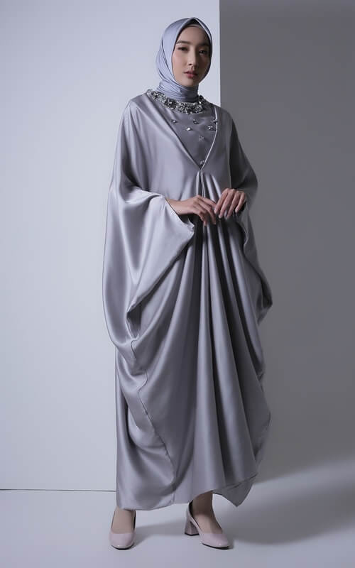 Detail pada bagian leher semakin melengkapi penampilan. Penggunaan lengan model sayap kelelawar juga membuat kaftan ini dilirik.