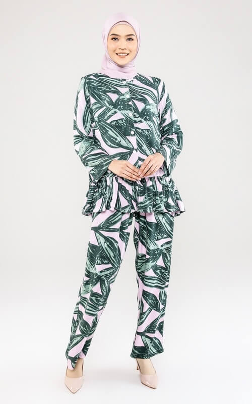 Motif setelan rayon satu ini sangat menawan dan menyejukkan mata, berkat pola dedaunan berwarna hijau yang mendominasi pakaian tersebut. Setelan ini menggunakan atasan model blouse yang dihiasi dengan ruffle lipit di bagian bawah pinggangnya.