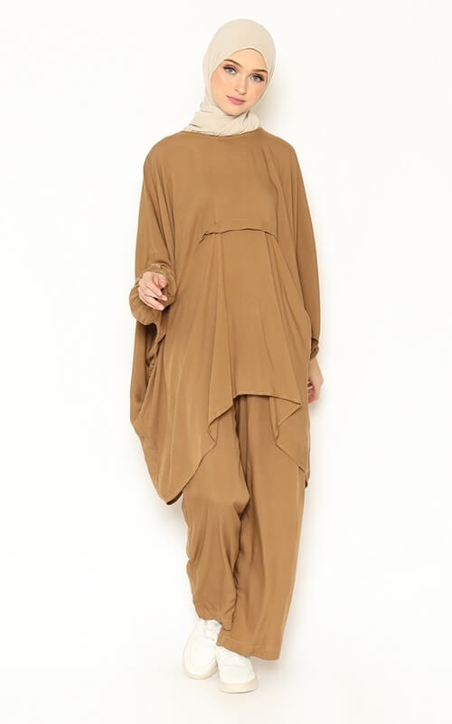 Jika, kamu tipe orang yang suka dengan desain yang simpel dan pakaian longgar. Model setelan bahan rayon polos ini mungkin akan cocok untukmu. Bagian atasannya mengadopsi model batwing yang cukup longgar, sehingga sangat cocok untuk para hijabers.