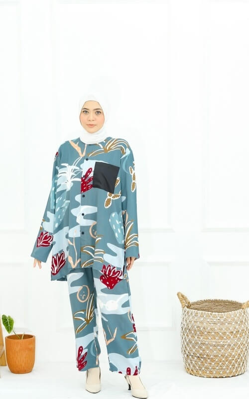 Setelan rayon kekinian motif kali ini juga cocok untuk kamu pencinta pakaian longgar. Bagian atasannya sengaja dibuat dalam ukuran besar karena mengadopsi model pakaian oversize.