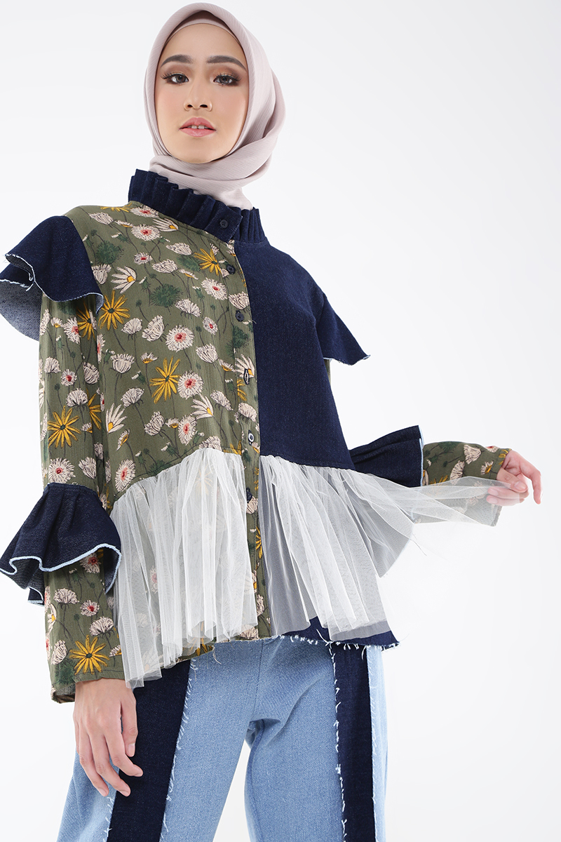 Eksplorasi perpaduan detail print dan tulle yang catchy dalam blus berbahan denim untuk pilihan gaya harian yang lebih on-point.