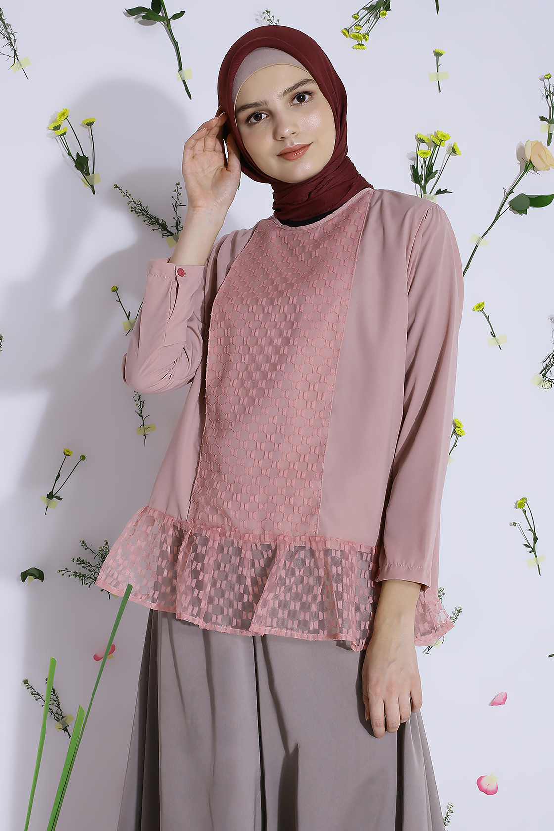 Bebas dari kesan monoton dengan blus yang memiliki kombinasi detail print dan aplikasi tulle yang catchy.