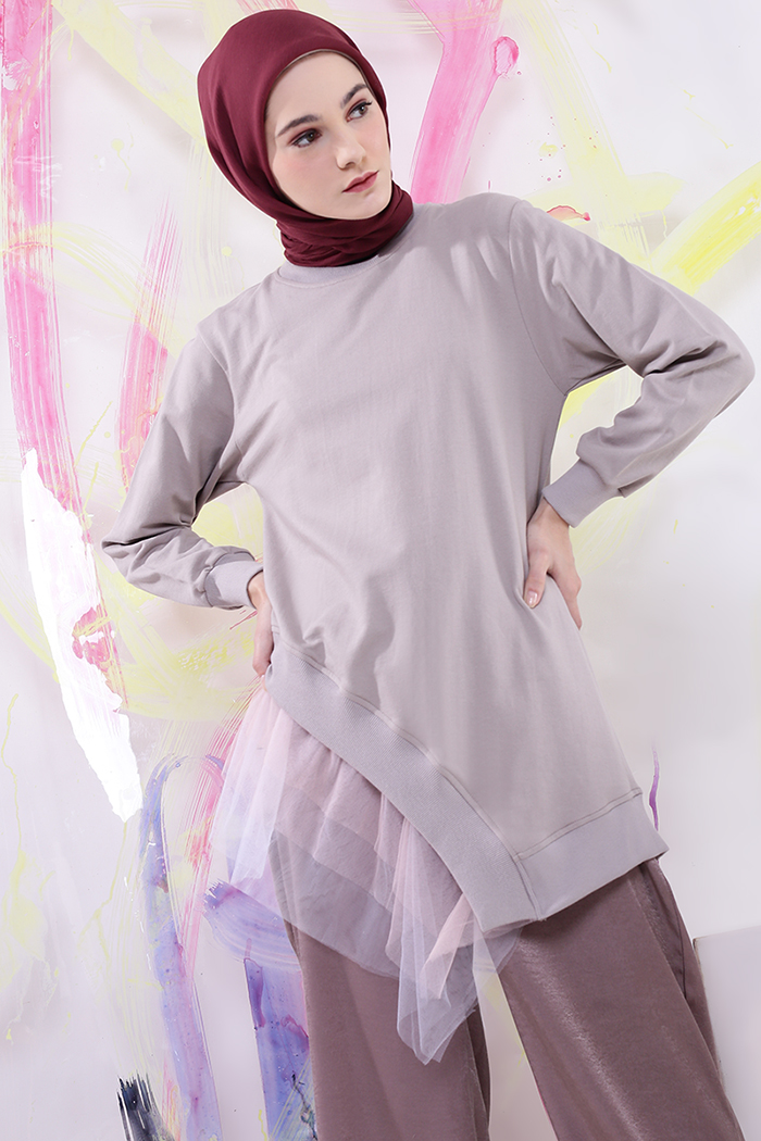 Sisipkan twist tersendiri pada tampilan lewat atasan yang tampak manis dalam kolaborasi aksen tulle dan siluet asimetris.