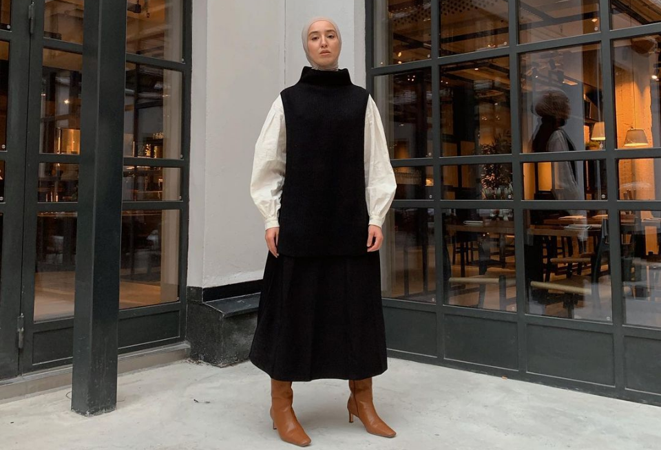 Perpaduan baju hitam putih selalu sukses ciptakan kesan elevate. Trik ini dianggap paling mudah untuk kamu tiru. Cukup padukan black sleeveless dress dengan white basic blouse favoritmu. Agar tidak terlihat monoton, pilih hijab berwarna kontras.