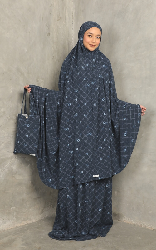 Ada handle panjang di atasnya yang bikin pouch mukena bisa disampirkan ke pundak seperti tote bag. Kalau warna dari mukenanya sendiri tampak kompak dari atasan, rok, dan juga tasnya. Bernuansa biru tua bertabur motif bunga bikin kesan yang fancy!