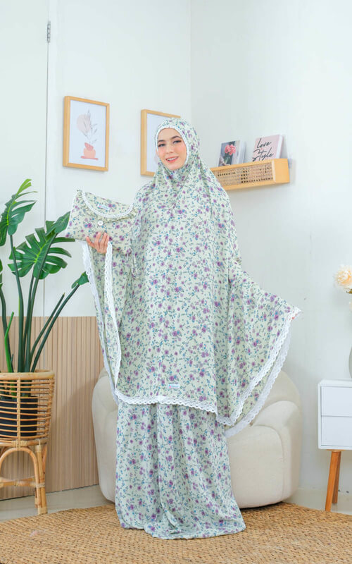Gorgeous! Setelan mukena ini bertabur bunga lavender di seluruh bagiannya. Warnanya juga senada jadi tampak cantik dan cocok jadi mukena lebaran. Bagian pinggirannya dihias dengan renda putih yang senada dengan bagian kening.