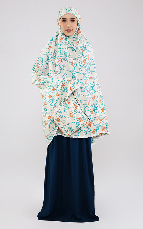 Bagian rok tampak polos dan atasannya bermotif tapi hanya sedikit. Bagian dahi tanpa kerut dengan tali belakang yang bisa diatur sendiri. Lalu di bawah dagu ada zipper yang bikin mukena ini jadi 2-in-1, Dear. Jadi kamu bisa pakai dengan atau tanpa kepala.