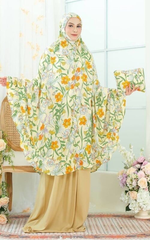 Serupa dengan mukena rayon nomor satu tadi, mukena ini juga punya bawahan polos yang kontras dengan atasan full motif. Tapi kali ini, warna rok dan atasan masih sama meski beda tone. Warna roknya juga kuning tapi lebih soft, sedangkan pouch mukena dibuat motif seperti atasan.