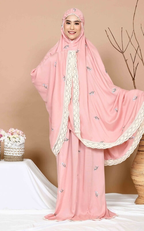 Tampilan yang girly dan tampak awet muda bisa kamu dapat dengan pakai mukena berwarna merah muda. Warnanya kalem dan semakin terasa segar dengan tambahan aksen renda putih di seluruh pinggirannya.