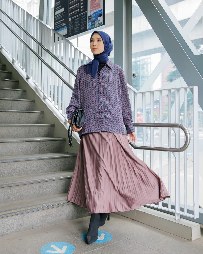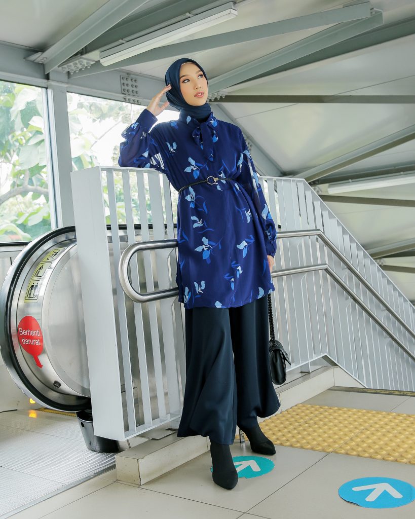 Untuk re-create look-nya, Minju rekomendasikan kamu untuk memakai tunik bermotif yang memiliki nuansa warna blue sapphire seperti inspirasi di bawah ini. Tunik ini juga memiliki detail pita di bagian kerah yang tentunya bisa membuat tampilanmu makin on-point, lho.