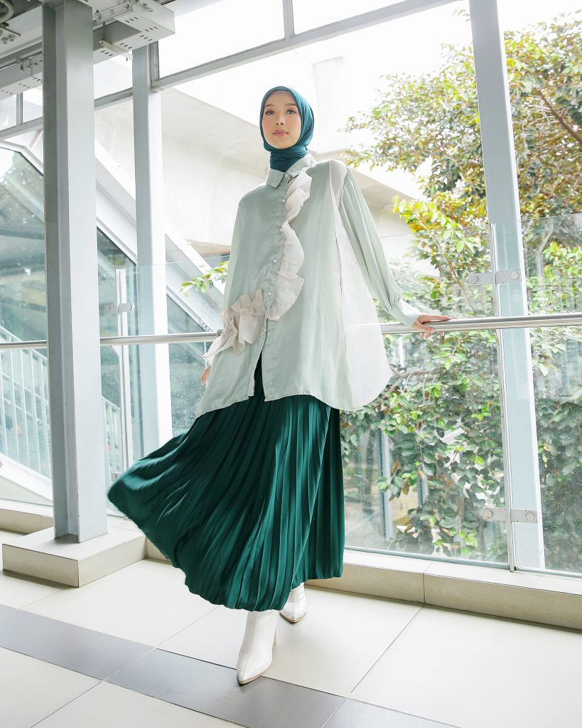 Kalau kamu tertarik untuk mencoba inspirasi outfit dengan warna hijau emerald, cobalah untuk memakai atasan yang berwarna pastel untuk di-pairing dengan pleats skirt yang berwarna emerald seperti di inspirasi bawah ini. Dijamin deh kombinasi outfit ini bisa membuat penampilanmu terlihat makin mewah dan juga stunning all day long!