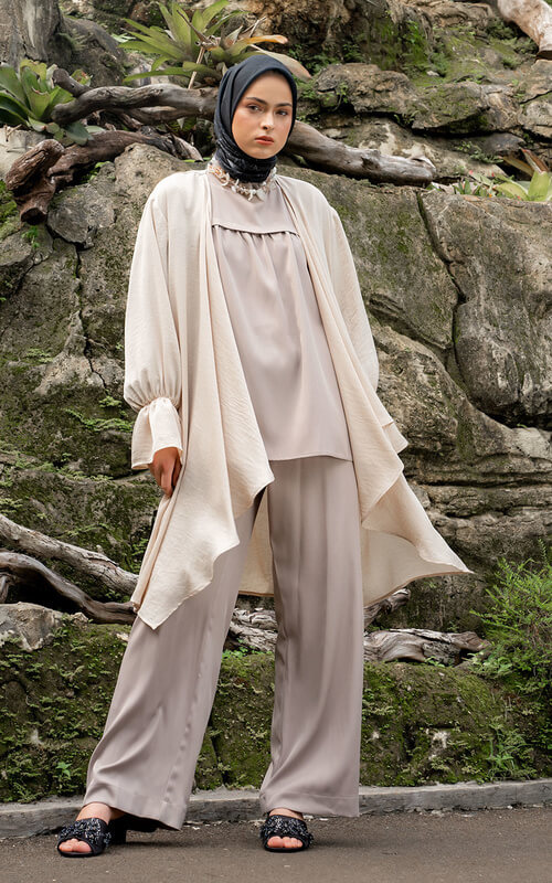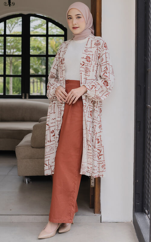 Nah, karena memang outernya sendiri dibuat dari bahan yang agak tipis, maka kamu bisa padukan dengan blouse polos, ya! Blouse warna nude turut memberikan keseimbangan yang tidak berlebihan, sehingga motif pada outer tetap menjadi daya tarik utama.