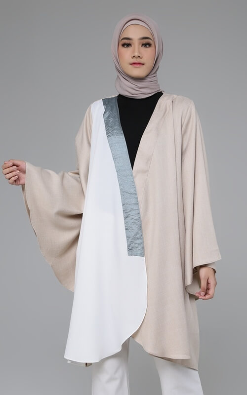 Outer panjang dengan aksen panel warna ini menawarkan konsep modern minimalis yang menarik. Perpaduan warna beige, putih, dan abu-abu memberi kesan unik namun tetap harmonis. Bagian lengan yang ada di outer ini juga membuat tampilan terlihat mewah dan fashionable.