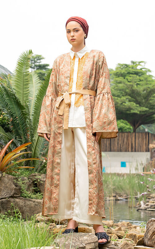 Outer dengan bentuk abaya kimono berbahan premium silk ini menghadirkan kesan anggun dan mewah dengan tekstur kain yang halus serta jatuh mengikuti bentuk tubuh. Sentuhan flowers printing motif pada permukaan kain memberikan aksen feminin yang lembut.