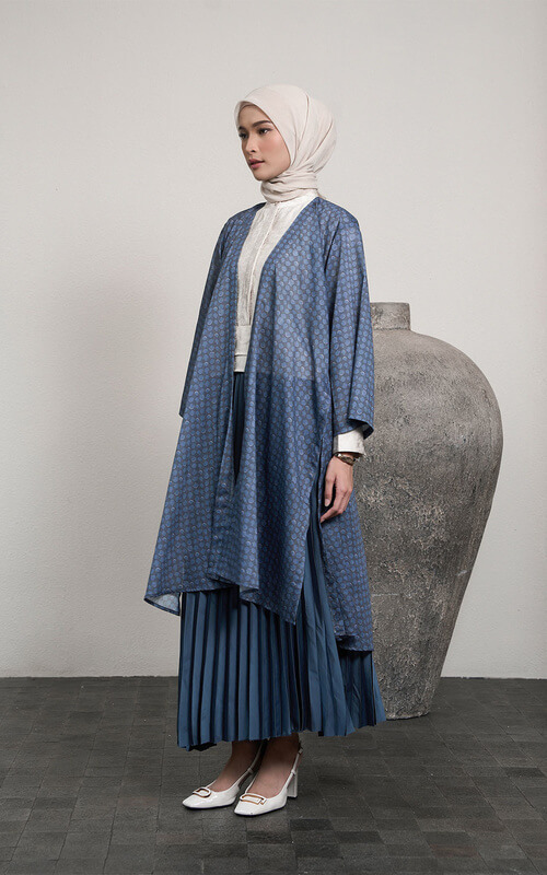 OOTD satu ini menggabungkan outer panjang berbahan ringan dengan motif geometris kecil yang memberikan kesan klasik namun tetap modern. Warna biru navy dengan gradasi memberikan efek elegan yang cocok dipakai untuk berbagai acara semi-formal.