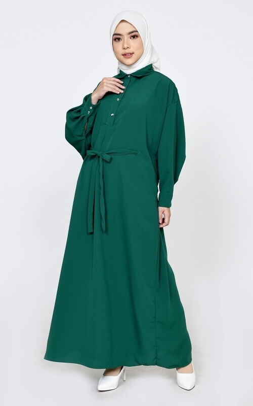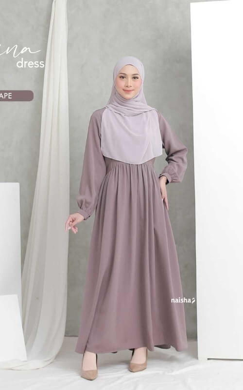 Dress ini berbentuk A line dengan kerutan di bagian pinggang. Model ini akan membuat kamu tampil lebih ramping tapi tetap syar’i.