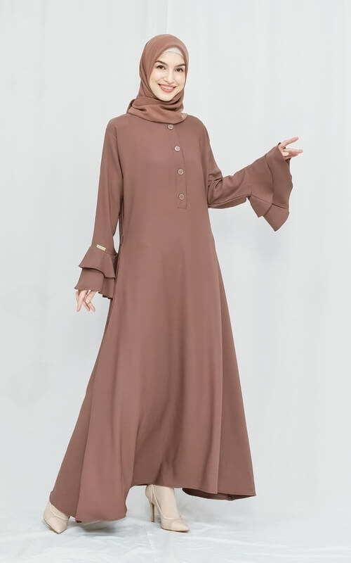 Gamis yang pertama ini cocok banget buat kamu si cewek bumi alias penggemar pakaian dengan nuansa earth tone. Bentuknya A line yang sangat cocok untuk pemilik tubuh persegi.
