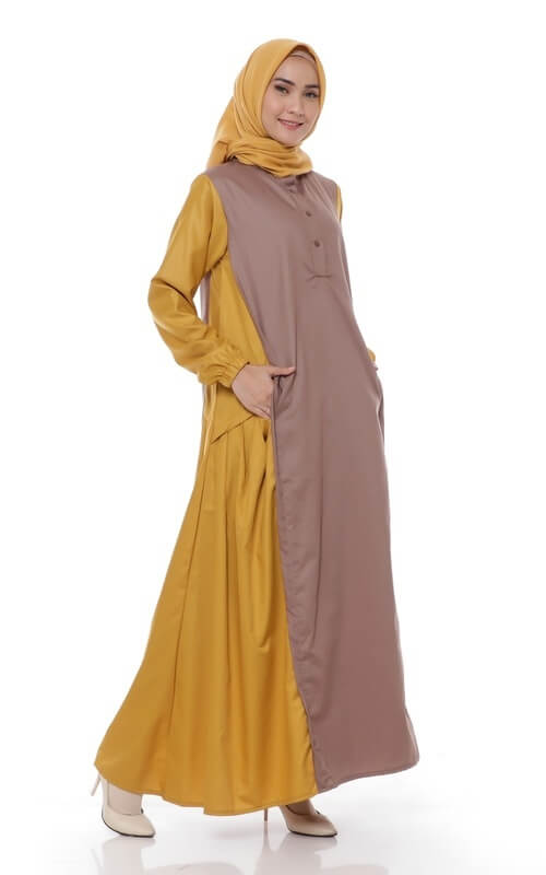 Warna kuning yang cerah sangat match ketika dipadukan dengan warna coklat mocca. Gamis ini punya bentuk A line yang memiliki bagian bawah lebih lebar.