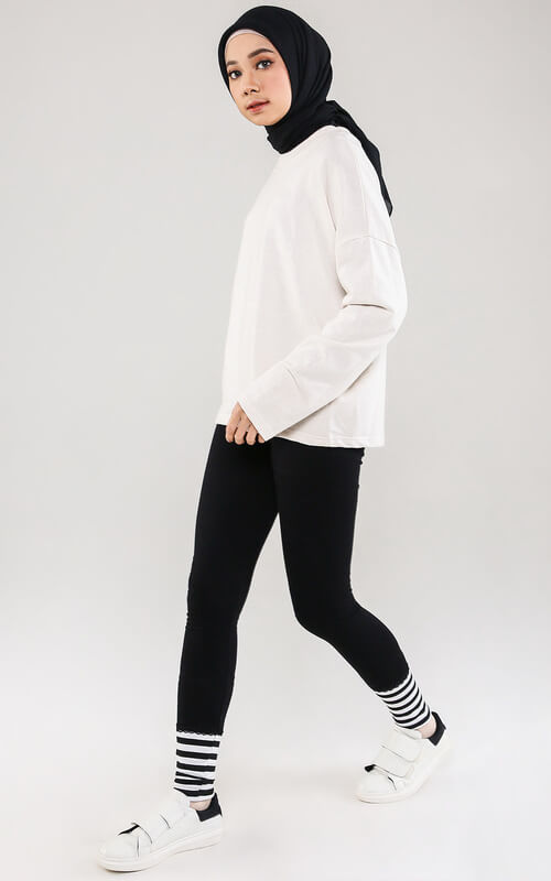 Jika warna hoodie dan legging kamu sudah gelap, maka berikan sedikit sentuhan cerah misalnya pada bagian hijab yang berwarna terang, atau bisa juga pada sepatu yang berwarna putih.