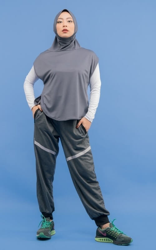 Kalau kamu kurang suka memakai celana ketat seperti legging, maka bisa menjajal jogger pants yang lebih longgar dan kombinasikan dengan hijab sport model rompi seperti foto di atas.