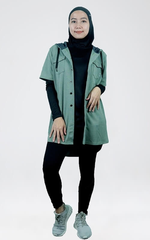 Nah, salah satu yang rekomended adalah hoodie lengan pendek warna sage green yang memiliki aksen dua saku dada dan kancing hidup plus tali. Warna cantik ini akan makin stylish jika kamu kombinasikan dengan hitam di bagian inner badan, leggings, dan juga hijab.