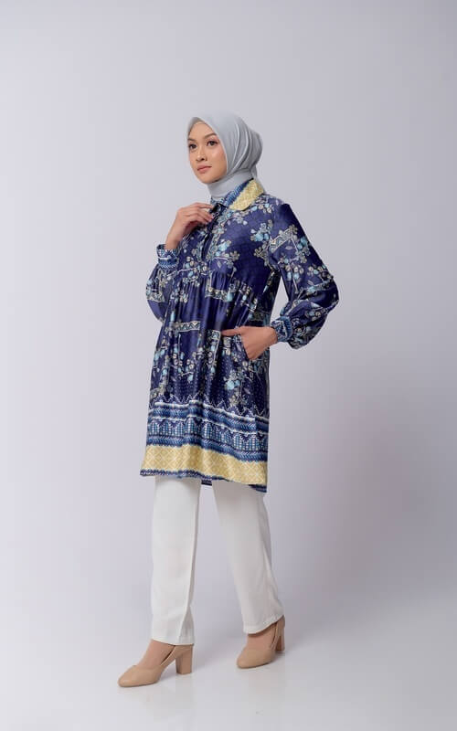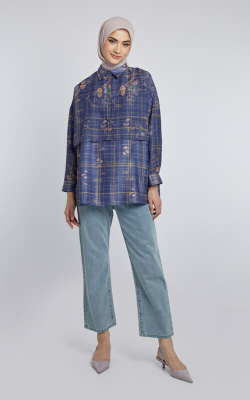Tampilan yang trendy sekaligus rapi saat ke kantor bisa kamu dapat dengan pakai kemeja kerja berwarna biru dengan taburan motif bunga. Warna biru yang tajam bikin kamu cuti atensi saat di tempat kerja, dan makin menarik dengan aksen sambungan di bawah dada, bikin kesan kemeja ini seolah berlayer 2 ya!