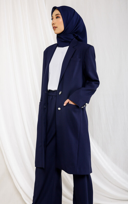 Berbalut warna navy di seluruh bagiannya, one set ini terdiri dari blazer panjang berkerah V dengan bawahan berupa celana model longgar yang bikin langkah kaki tetap nyaman seharian.
