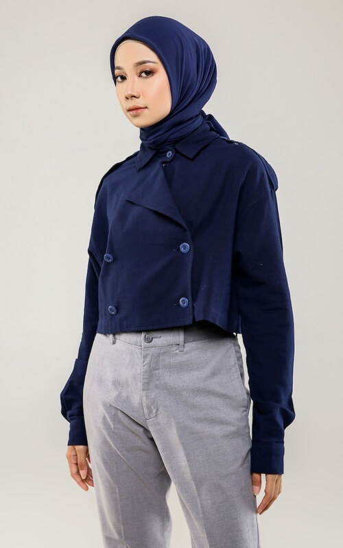 Kata siapa pergi ke kantor nggak bisa pakai OOTD kemeja yang bergaya? Tampil modis saat harus presentasi di depan klien bisa pakai blazer model crop warna biru tua. Bikin kesan lebih muda tapi tetap terkesan formal kok. Sebab baju atasan ini punya kerah dengan kancing depan.