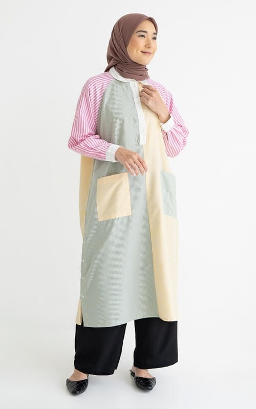 Tunik yang satu ini sangat unik dan berani karena memadukan beberapa kain stripped/bergaris dengan warna-warna berbeda. Tunik satu ini cocok banget buat kamu si cewek kue yang menyukai pakaian warna warni.