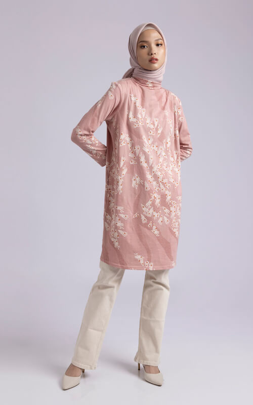 Nah, kalau yang satu ini adalah tunik merah muda yang cocok buat gaya busana girly. Motif putih di atas kain merah muda bikin tampilan cute lho! Kalau kamu ingin bikin ilusi tubuh lebih tinggi, bisa pakai tunik dengan potongan H-line seperti ini.