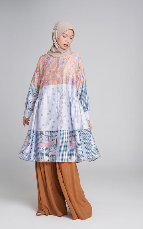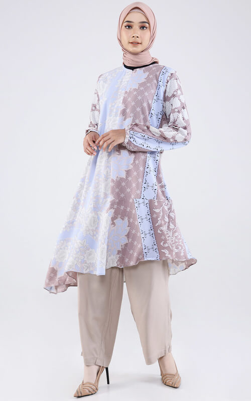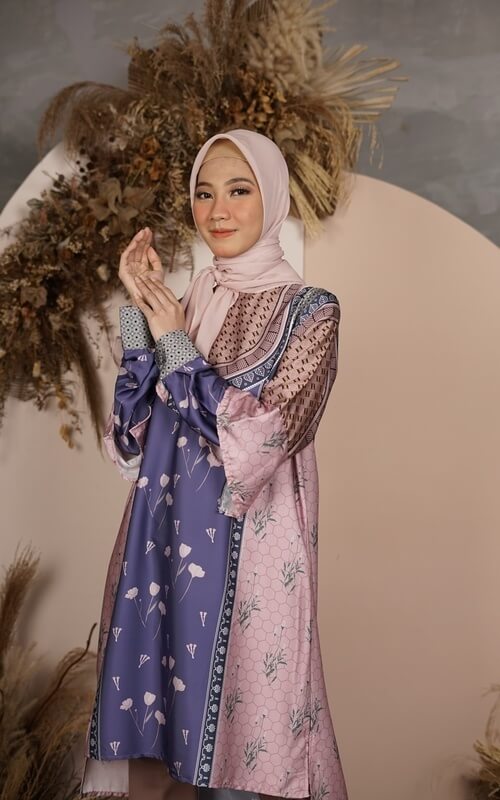 Boleh nih sesekali coba pakai tunik dengan bahan yang glossy dan full motif untuk bikin tampilan elegan dan tampak lebih dewasa. Selain dari segi bahan, tunik ini juga tampak eye catching dari model lengan bertumpuknya. Jadi tunik ini punya dua lengan, Dear.