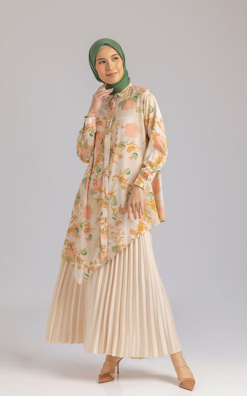 Tampil simple dan kalem bisa coba pakai tunik kekinian motif berwarna nude. Desain asimetris bikin kesan anti boring dan sekaligus bisa menutup aurat karena bagian belakang lebih panjang dari depan. Potongan badannya juga longgar dan cocok buat style hijab syar’i.