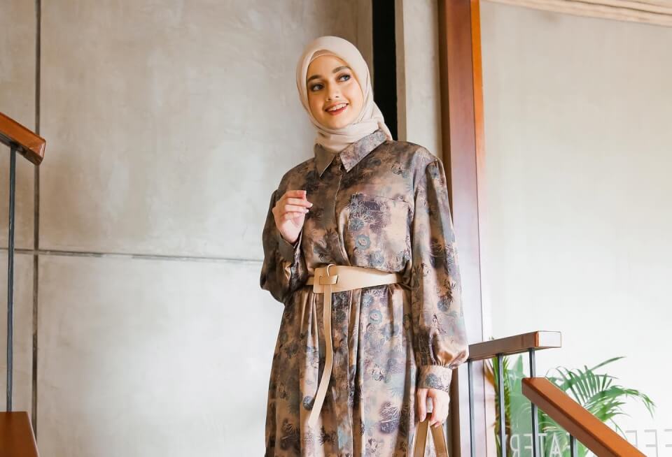 Tampil simple dan kalem bisa coba pakai tunik kekinian motif berwarna nude. Desain asimetris bikin kesan anti boring dan sekaligus bisa menutup aurat karena bagian belakang lebih panjang dari depan. Potongan badannya juga longgar dan cocok buat style hijab syar’i.