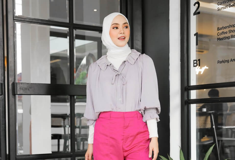 Biar makin catchy, kamu bisa padukan dengan hijab bernuansa pink dan rok / celana abu-abu muda. Kamu bisa tambah pointed heels kalau ingin tampak lebih feminim.