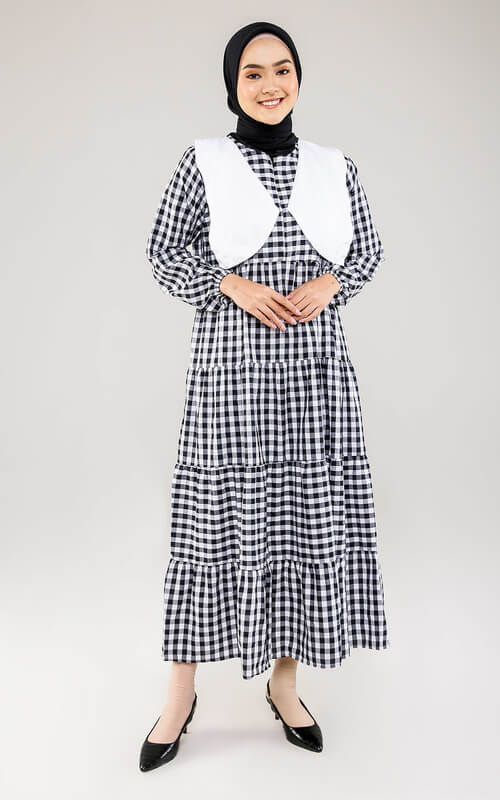 Anti boring, motif kotak pada midi dress ini berbentuk unik dengan vibes vintage. Bagian rok ada aksen sambungan, dan ujung lengan pakai karet jadi lebih wudhu friendly. Kamu bisa pilih kerudung hitam dan sepatu warna senada sebagai pasangannya. Super simple buat dicontek!