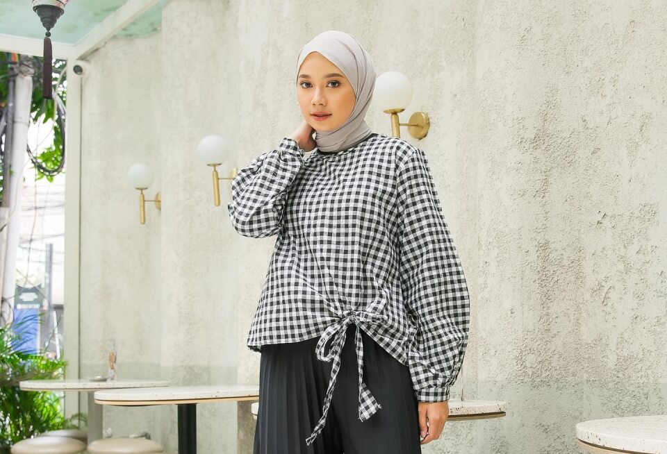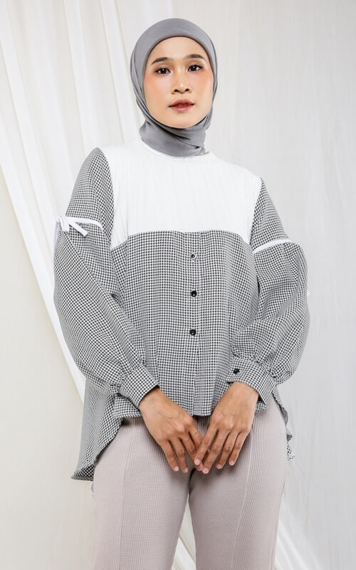 Sementara pada celana tampak motif kotak kombinasi kain polos warna putih, nggak terkesan monoton ya. Tinggal tambah hijab hitam agar tampak senada dan semakin trendy!