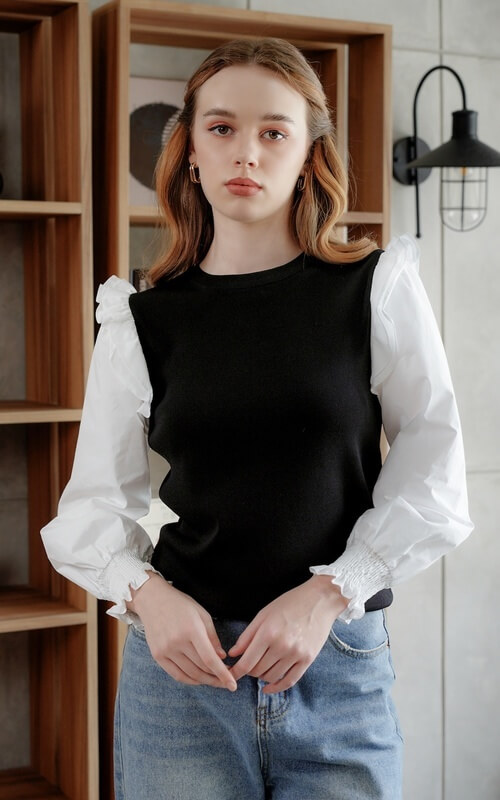 Sementara bagian badan seluruhnya tertutup warna hitam dan tampak kontras dengan lengan yang full putih. Eye catching banget, ya! Bisa tambahkan celana denim biru untuk mempertegas casual look kamu.