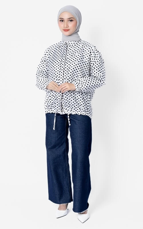 Buat gaya casual yang feminim dengan pakai atasan black and white berlengan puff kayak gini, Dear. Aksen ruffle di pundak bikin kesan tubuh lebih tegak, sekaligus berikan sentuhan anti boring. Detail serupa juga ada di ujung kedua lengan, lengkap dengan aksen karet.
