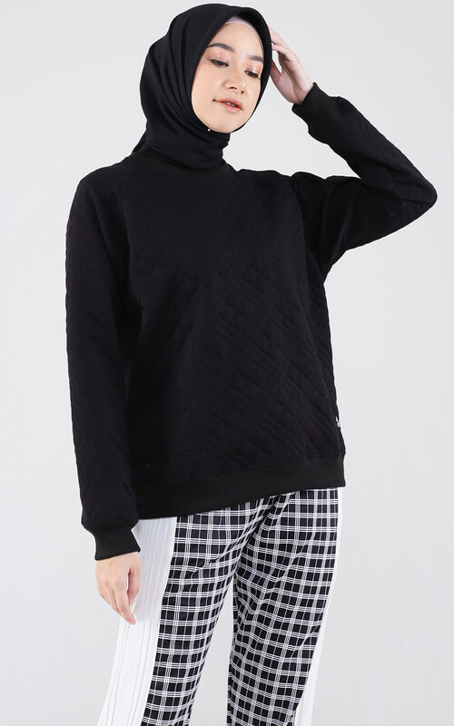Terakhir, ada gaya hangout casual yang kece dengan memadukan kaos polos dan celana full motif. Kaos hitam lengan panjang ini berbahan tebal jadi aman buat kamu yang berhijab.