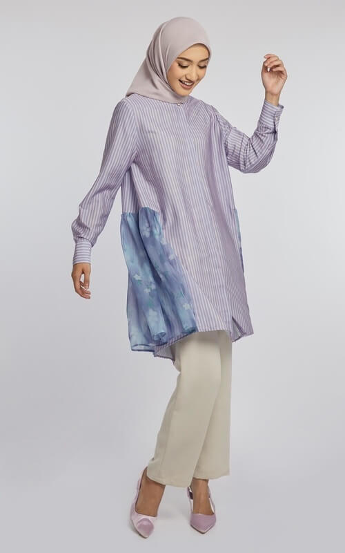 Didominasi oleh motif garis vertikal, tunik ini bikin kesan tubuh lebih jenjang. Sedangkan perpaduan kain bermotif di bagian belakang memberi kesan anti boring.