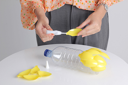 - Berikan sedikit lem pada bagian depan gagang sendok lalu tempelkan sendok dengan posisi terbalik. Untuk jenis lem disarankan untuk memakai lem yang sangat kuat agar lebih mudah menempelnya. Tempel dengan rapi sehingga membentuk seperti sisik hingga menutupi seluruh botol.