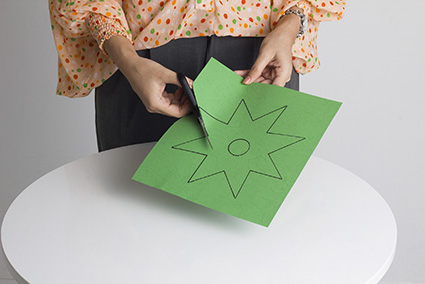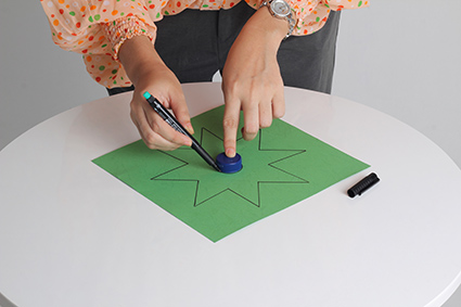 - Sekarang buatlah daun bagian bawah dengan pola seperti pada foto, lalu gunting. Jangan lupa untuk membuat pola di bagian tengah dengan menggunakan tutup botol. Setelah dibolongi bagian tengahnya, masukkan pola daun tersebut melewati mulut botol.