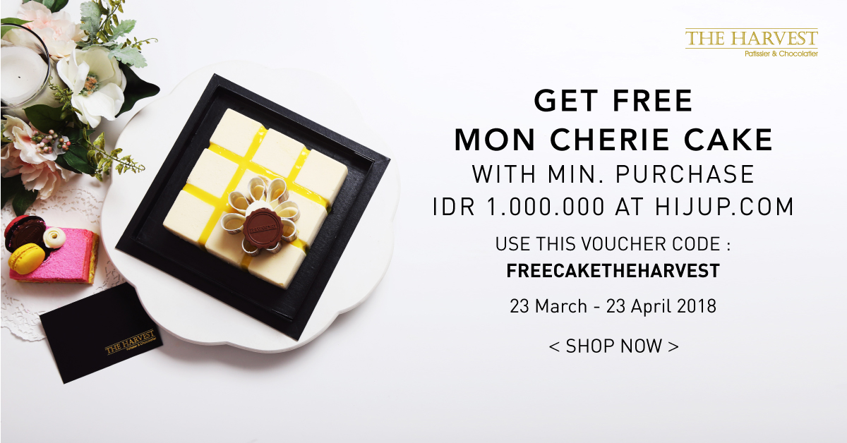 Dengan beberlanja di HIJUP.com selama periode 23 Maret sampai 23 April 2018, kamu bisa mendapatkan Mon Cherie Cake dari The Harvest Patissier & Chocolatier dengan ketentuan sebagai berikut: