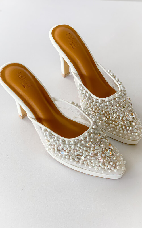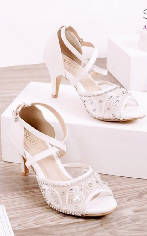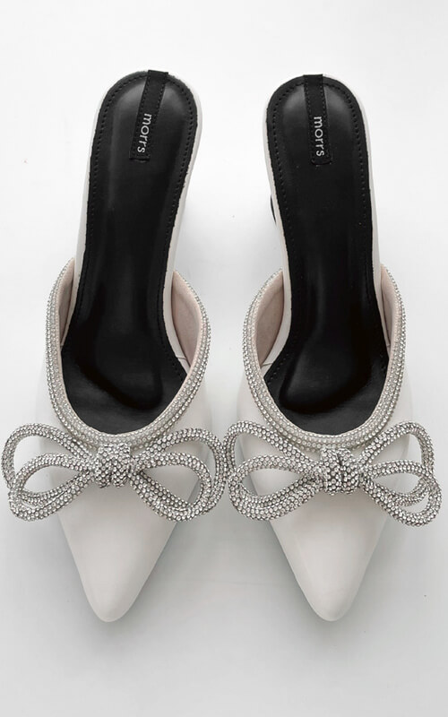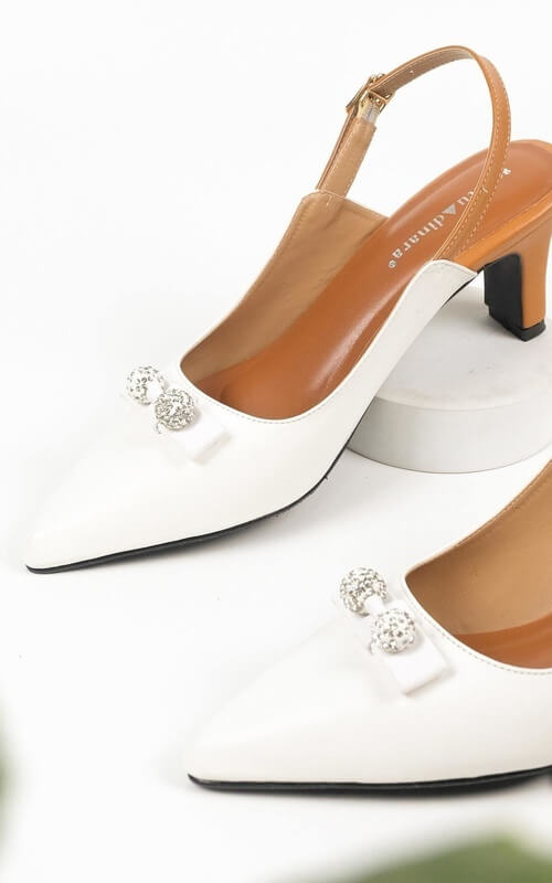 Jika sebelumnya kamu sudah berkenalan dengan heels yang dihiasi berlian kecil, kali ini kamu harus tau bahwa ada sepatu heels warna putih semi formal yang dihiasi berlian besar di bagian depan selop.