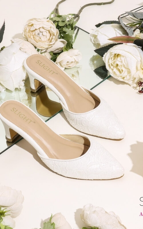 Lebih suka heels dengan model sederhana? Tepat sekali, kamu bisa memakai heels putih selop yang satu ini. Heels warna putih cantik ini desainnya memang dibuat sangat sederhana. Meski sederhana namun tetap terlihat cantik karena bagian selopnya dihiasi brokat.