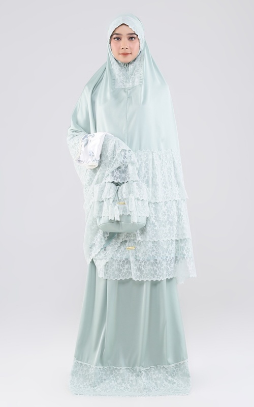 Mukena berbahan silky cotton dengan hiasan lace, dengan detail karet di bagian kepala memang favorit. Sederhana namun elegan, mukena ini bisa jadi pilihan untuk salat Idul Adha.