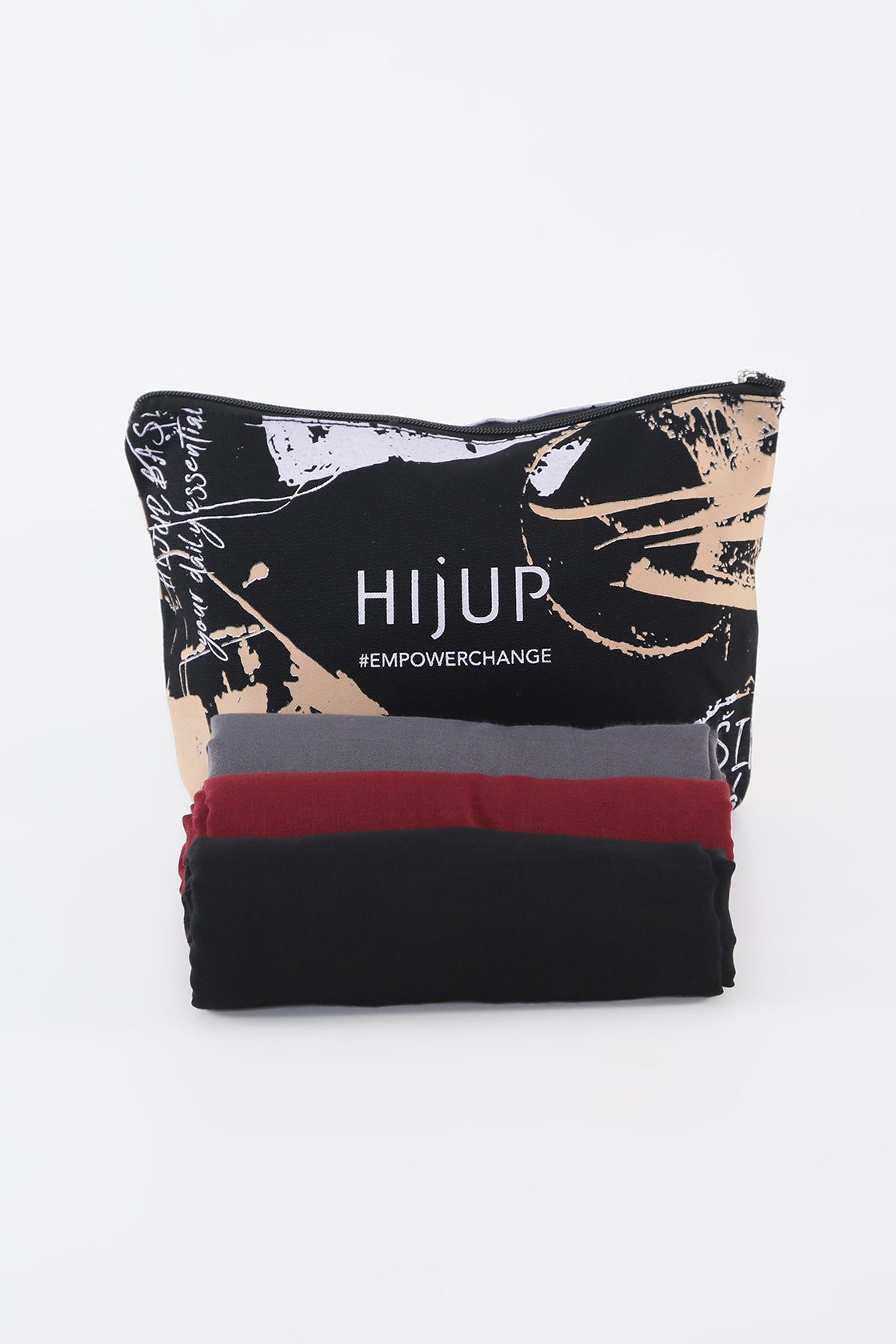 Koleksi wajib punya! HIJUP BASIC Mars Set sendiri merupakan 1 set koleksi hijab polos yang terdiri dari 3 voal scarf berwarna hitam, maroon, dan abu-abu tua.