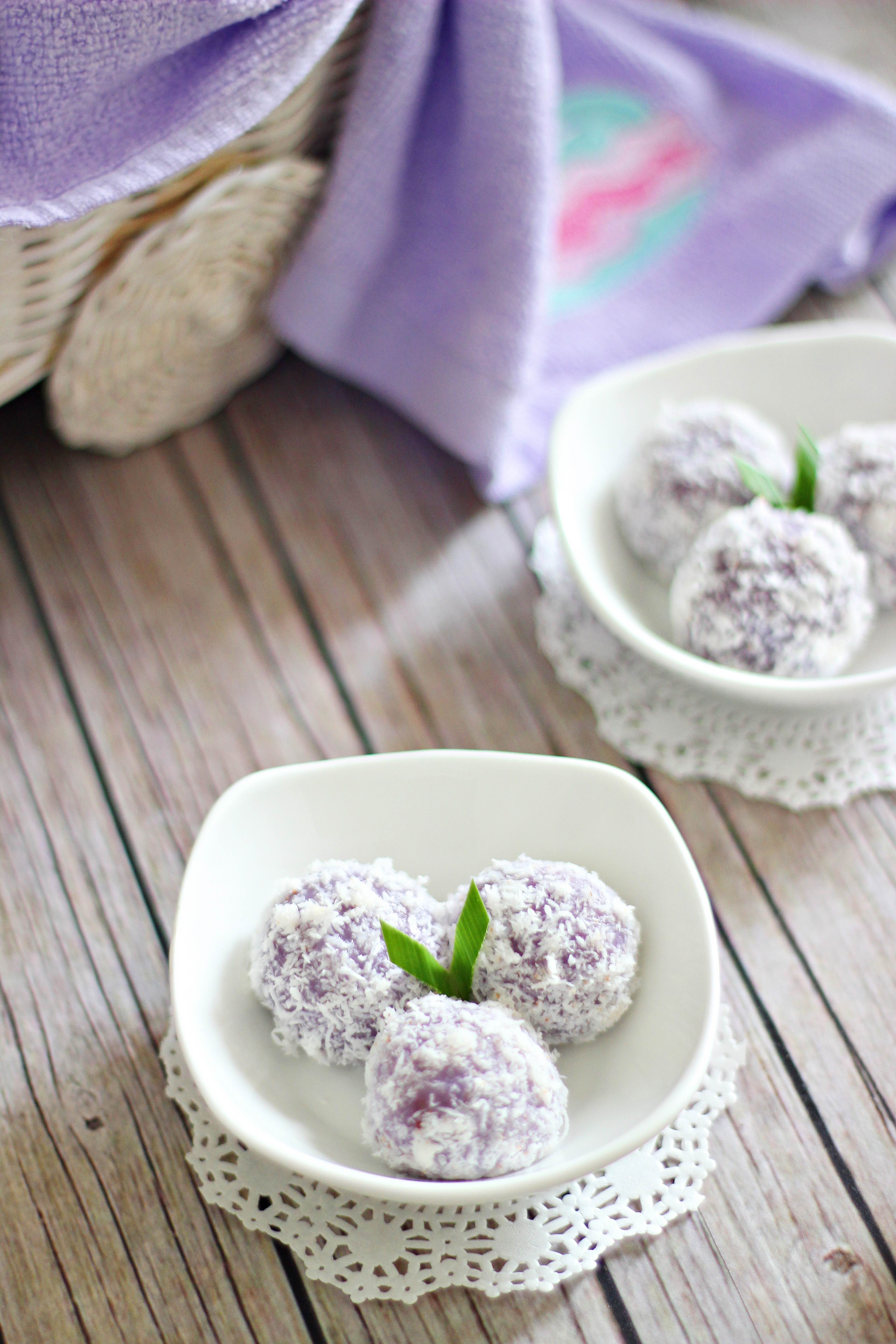 Bahan dasar klepon adalah tepung ketan, parutan kelapa, dan gula merah, sehingga bertekstur kenyal dan manis di dalam. Cairan gula merah di dalam klepon berbentuk bola ini menjadi ciri khas klepon karena meleleh saat digigit. Biasanya, adonan sering dicampur dengan pandan sehingga berwarna hijau. Namun kita bisa membuat klepon dengan warna-warni lainnya, seperti klepon ubi ungu di bawah ini. Resep mudah klepon ubi ungu dari Nisa (@nisacookie) spesial dipersembahkan untuk kamu yang ingin berkreasi dengan klepon. Berani mencoba? Selamat berkreasi!