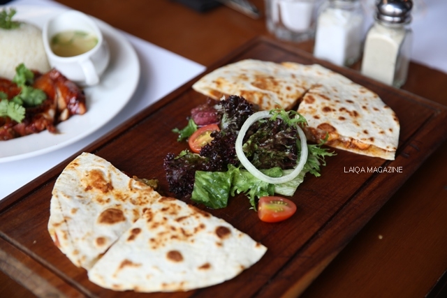 Ayam di balik tortilla ini terasa lebih hangat dari biasanya. Rempah-rempahnya lebih terasa. Terdapat empat potong quesadilla dalam satu porsi. Isinya yang tebal sebenarnya terasa cukup mengenyangkan untuk dijadikan makanan pembuka.