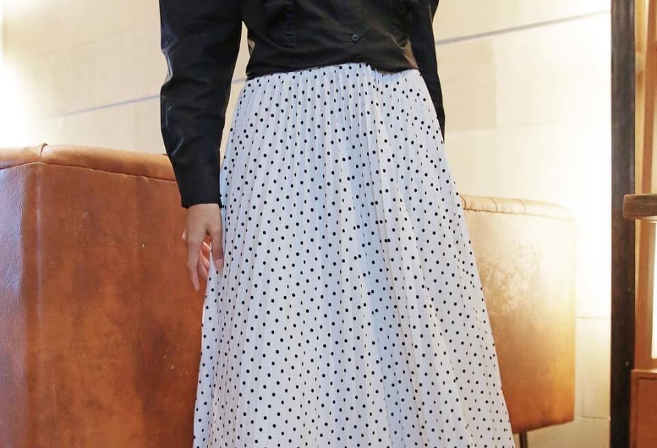 Rok model plisket asimetris layak juga kamu coba sebagai outfit of the day yang tidak kalah trendi. Rok ini kamu padukan dengan legging yang akan menutup bagian kaki kamu. Pilihan warna gelap mengesankan kaki kamu menjadi lebih jenjang.